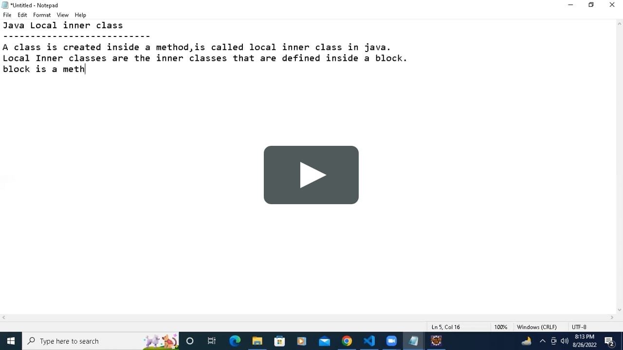 . Local - Method Inner class Anonymous Inner class Local method Inner class. The inner class in Java means one class which is a member of another class. The relation between outer class and inner class is said to be a Has-A relationship.